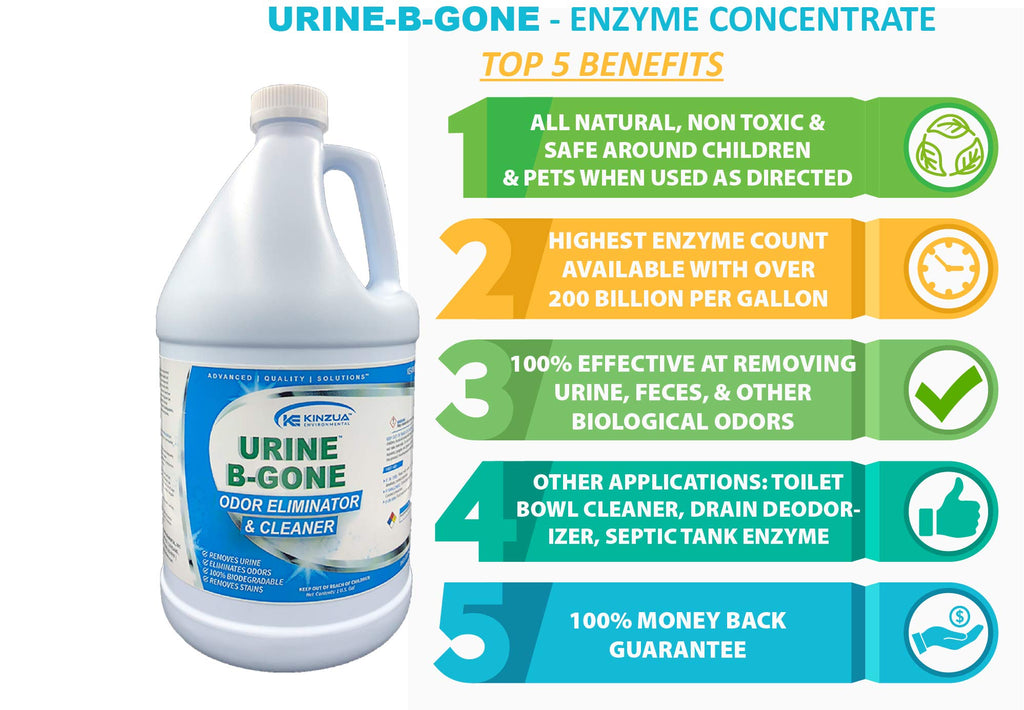 • HIGHEST ENZYME COUNT AVAILABLE: Each of these gallons (128 oz) of Urine-B-Gone contain over 200 billion enzyme count that become your 'army of enzyme soldiers' that liquefy, digest, and destroy urine and feces.